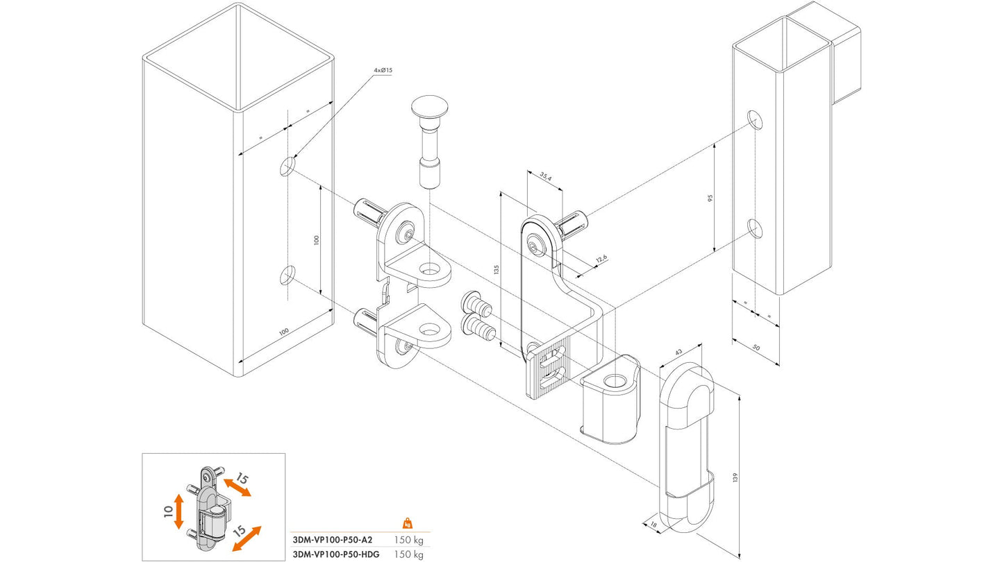 Nerūdijančio plieno vyriai su „Quick-Fix“ tvirtinimo sistema metaliniams vartams. Šiuos vyrius galima reguliuoti trimis kryptimis: aukštyn/žemyn, į kairę/dešinę ir vartų varstymo kryptimi. Taip pat yra variantas su karštai cinkuota svirtimi.